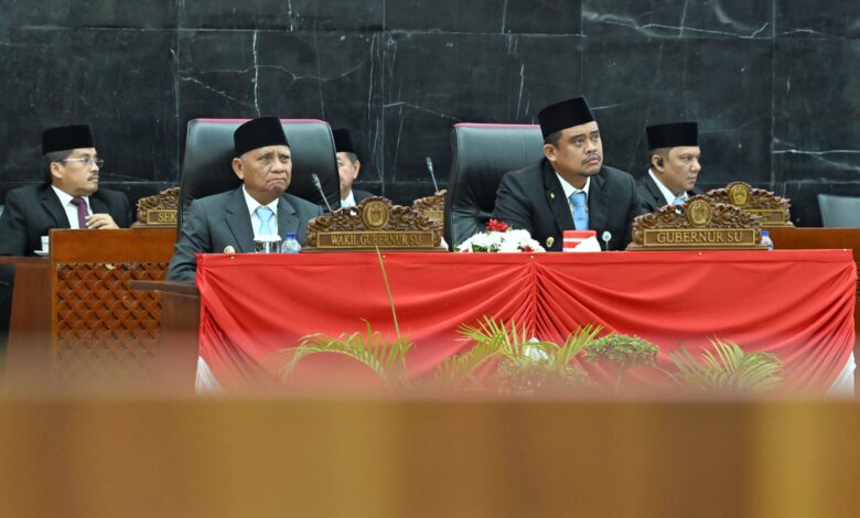 Sumut – Gubernur Sumatera Utara (Sumut) Bobby Nasution bersama Wakil Gubernur Surya menghadiri acara mendengarkan pidato kenegaraan Presiden RI Prabowo Subianto dalam rangka memperingati Hari Ulang Tahun (HUT) ke-80 Kemerdekaan Republik Indonesia. Kegiatan yang digelar secara virtual ini berlangsung di Gedung Paripurna DPRD Sumut, Jalan Imam Bonjol, Medan, Jumat (15/8/2025).