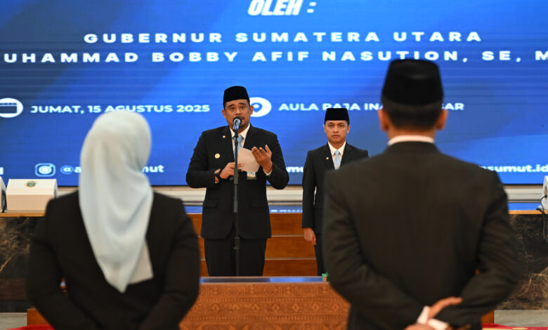 Sumut – Gubernur Sumatera Utara (Sumut) Muhammad Bobby Afif Nasution melantik lima Pejabat Pimpinan Tinggi Pratama (Eselon II) di lingkungan Pemerintah Provinsi Sumut. Dalam arahannya, Bobby menegaskan pentingnya memaksimalkan program pembangunan, mengelola anggaran secara efektif, dan menjaga integritas.